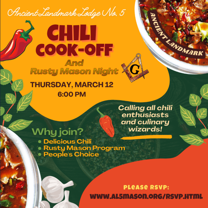 I hope this message finds you all safe, warm, and happy, Brighten up your cold winter with some piping-hot chili this Thursday, Feb. 10 at the Stated Meeting. This is the annual chili cook-off contest (see attached flyer). Contestants set up at 5:30 with chili feed at 6:00 with Stated Meeting at 7:00. We plan to open the Stated on the 2nd degree, unless we have EAs.