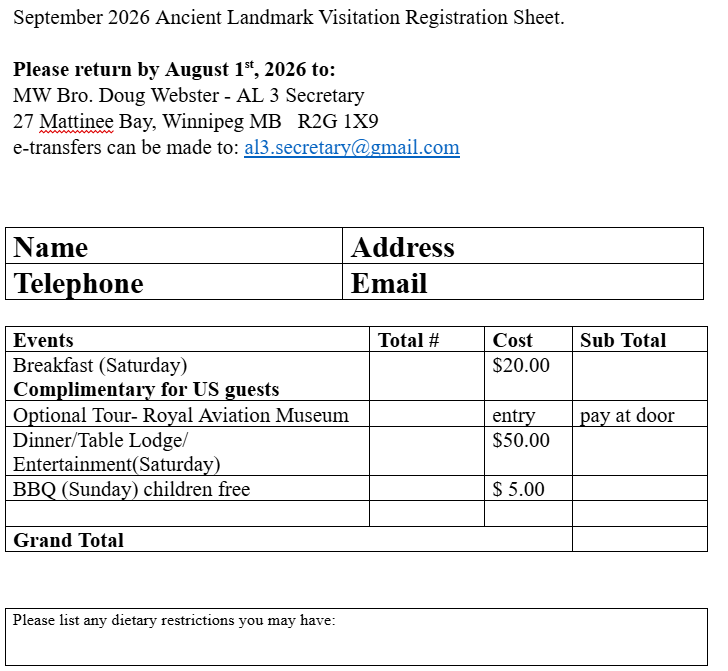 We have received a formal invitation to visit our sister Lodge, Ancient Landmark 3, in Winnipeg. The visit will be over the Labor Day weekend. Details are being worked out, but normally we travel up there on Friday, returning on Sunday. This year we will be providing each AL5 Brother who makes the trip a flat $300 stipend to help with costs. (No tracking expenses or turning in receipts!).