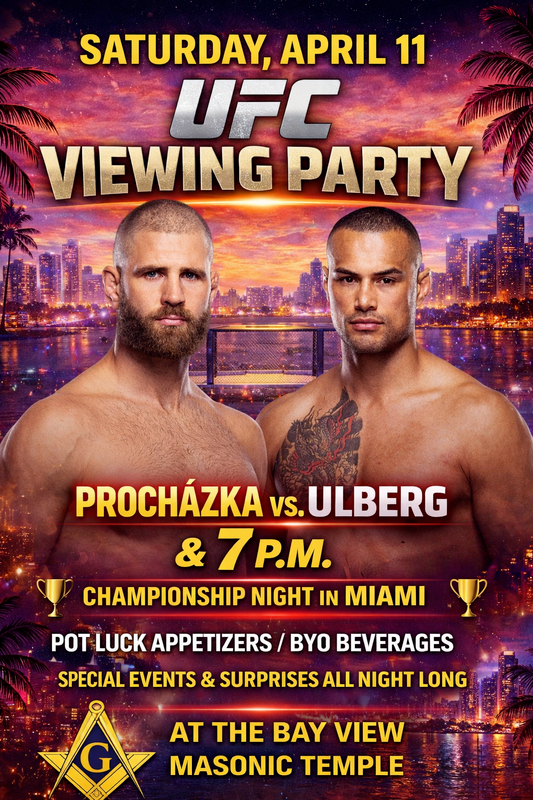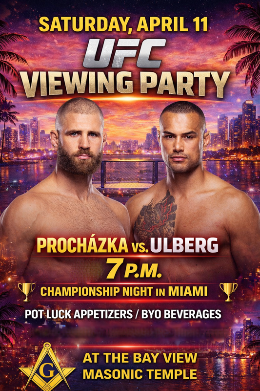 We’re looking forward to a great night of fellowship this coming Saturday, April 11, as we host our next UFC Watch Party starting at 7:00 p.m. at the Bay View Masonic Temple. Procházka vs. Ulberg headlines the card, along with a full lineup of championship-level fights. Whether you're coming directly from Grand Lodge or joining us later in the evening, this will be a great opportunity to relax, connect, and enjoy time together outside of the Lodge room. Details: