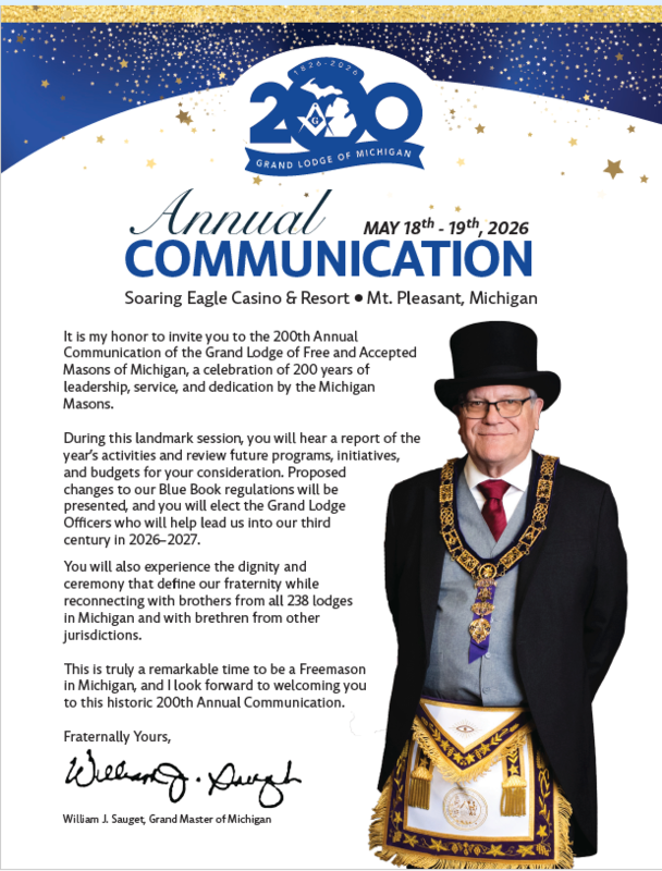 Fellowship Lodge 236 will host this years District 15,16 & 17 BGP Legislative meeting on Tuesday, April 21st at the Swartz Creek Masonic Temple. 6 PM Dinner/7 PM Lodge. In preparation, I have attached the Advanced Notice for the Grand Lodge of Michigan's May 18 & 19, 2026 Annual Communication which includes the proposed amendments to the Blue Book that will be discussed at the April 21st Legislative meeting and later voted Annual Communication held at the Soaring Eagle Resort and Casino in Mt. Pleasant. Please read through pages 11 through 26 and be prepared with any questions you may have of the BGP's at the April 21st meeting.