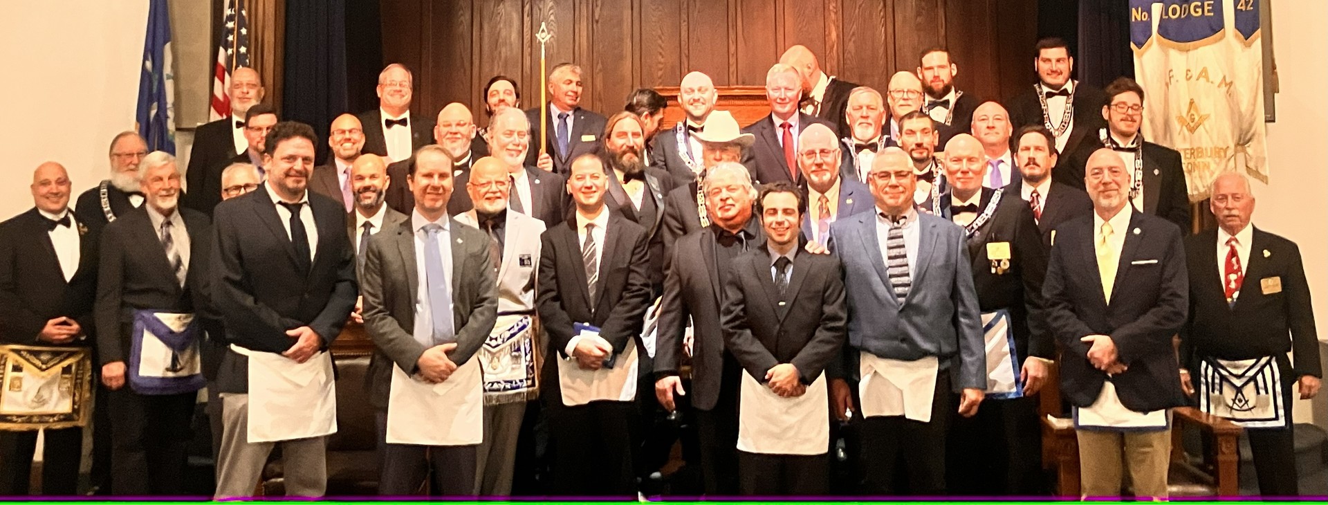 Lodge officers wear formal attire, tuxes/dark suits, jewels, aprons, and top hat. Lodge members wear dark suits and aprons.