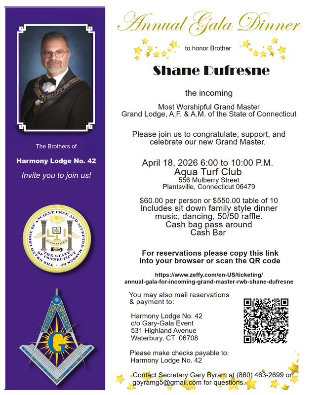 Brothers All, Harmony Lodge No. 42 is proud to be hosting this year's annual gala for incoming MWGM Shane Dufresne, our lodge Past Master of 2009 and one of many of our lodge worshipful brothers who have proudly served as MWGM of CT-Grand Lodge. The gala is being held close to home at the prestiges Aqua Turf Club. Seats are $60 per person or $550 to reserve a table of 10 in advance. I'm assisting in the seating arrangements and will try to keep Harmony members and their guest together. Attire shall be business formal, dark suits and ties, and officers are not required to wear a tuxedo. Checks can be mailed to the lodge, addressed to my attention, or use the below Zeffy QR Scan code and know that no additional fees are applied or requested. Feel free to contact me if you have any questions. Fraternally yours, Gary A. Byram Secretary C: (860) 463-2699 |