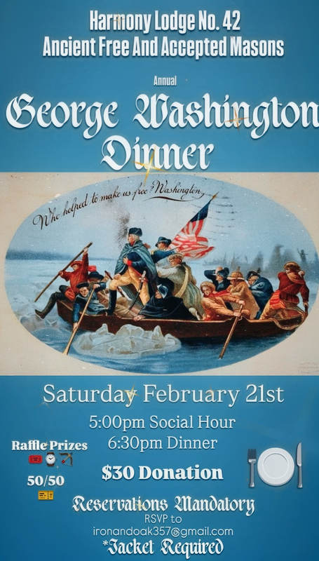 | Brothers All, We have our annual George Washington Dinner coming up soon on February 22nd, a Saturday afternoon with an arrival time of 5:00PM, dinner at 6:30PM. See the announcement for detail and to make your reservation. This is a great opportunity to introduce a friend to the fraternity and tour the lodge. |