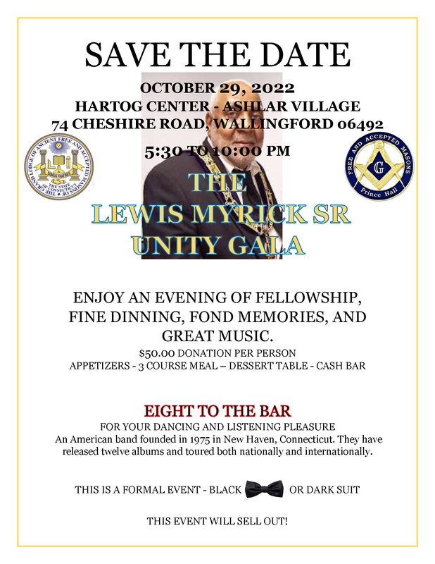 The Lewis Myrick Sr. Unity Gala - Saturday, Oct 29th, 2022. From 5:30PM - 11PM. Location: Hartog Center - Ashlar Village, 74 Cheshire Rd. Wallingford, CT 06492. (Flyer Event) - (Add to calendar) | (Tickets & more info).