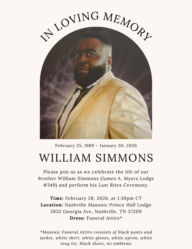 Hello Brothers, As you may know, Brother William Simmons from James A. Myers Lodge #349 passed away recently. They will be hosting a Last Rites Ceremony for him at the Prince Hall Nashville Masonic Hall (2832 Georgia Ave.) on Saturday, February 28 at 1:30pm. Here is a flier with more info. Thank you in advance. IMG_7536.png |