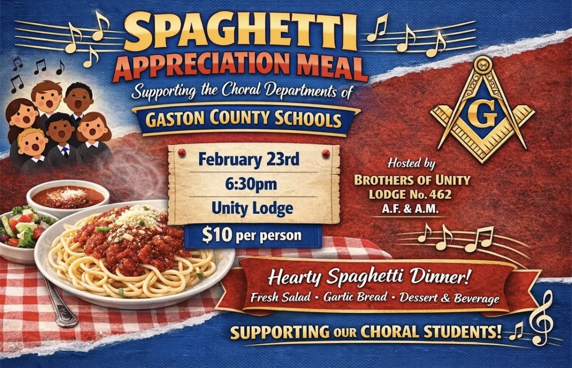 Brethren, Please join us tonight February, 23, 2026 at 6:30PM at UNITY LODGE #462 122 N. MAIN ST. IN LOWELL for a Spaghetti Appreciation Meal supporting the choral departments of Gaston County Schools