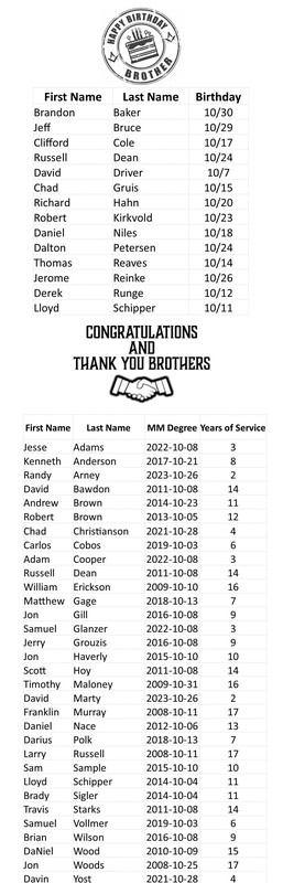 Brothers, Welcome to October! OCTOBER CALENDAR Click on the date to take you to the event on Grand View for details October 2, 2025 - Stated Meeting6:00pm Meal Cracker Barrel. Garlic Steak Tips/Grilled Smokehouse Chicken, Mashed Potatoes and Gravy, Biscuits, Side 2, Lemonade. $15 RSVP Deadline Wednesday Oct 1. Select from 3 choices ~ #1 Meal Ticket Pay Online, #2 Meal Ticket Pay at the Door, #3 No meal 7:00pm Stated Experience