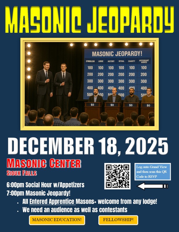 December 18, 2025 ~ Masonic Jeopardy!January 1, 2026 - Stated Meeting 6:00pm Meal $15 RSVP on Grand View. Option #1 ~ Pay Online, Option #2 ~ Pay At the Door, Option #3 ~ No Meal 7:00pm Stated Experience