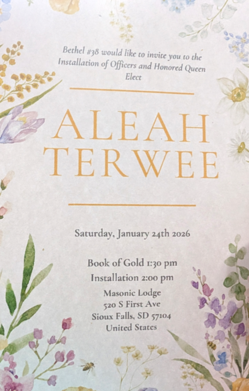 On Monday, January 27th, at 6:30 p.m., the Young Men of Liberty Chapter will hold an Installation of Officers. Master Councilor-Elect Caleb Zahn would like to extend a personal invitation to the Members of the Masonic Lodges in Sioux Falls, to attend this event. An advisor installation will also happen in conjunction with the chapter installation, along with the installation and crowning of our new chapter, Sweetheart. I highly encourage you to come and attend this event! Fraternally, Dad Derek Runge State Chapter Dad South Dakota DeMolay |