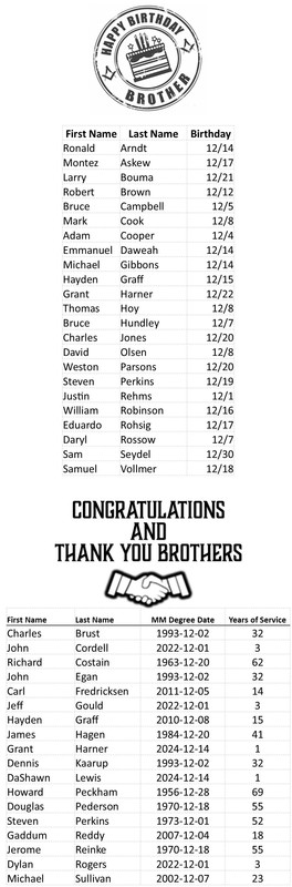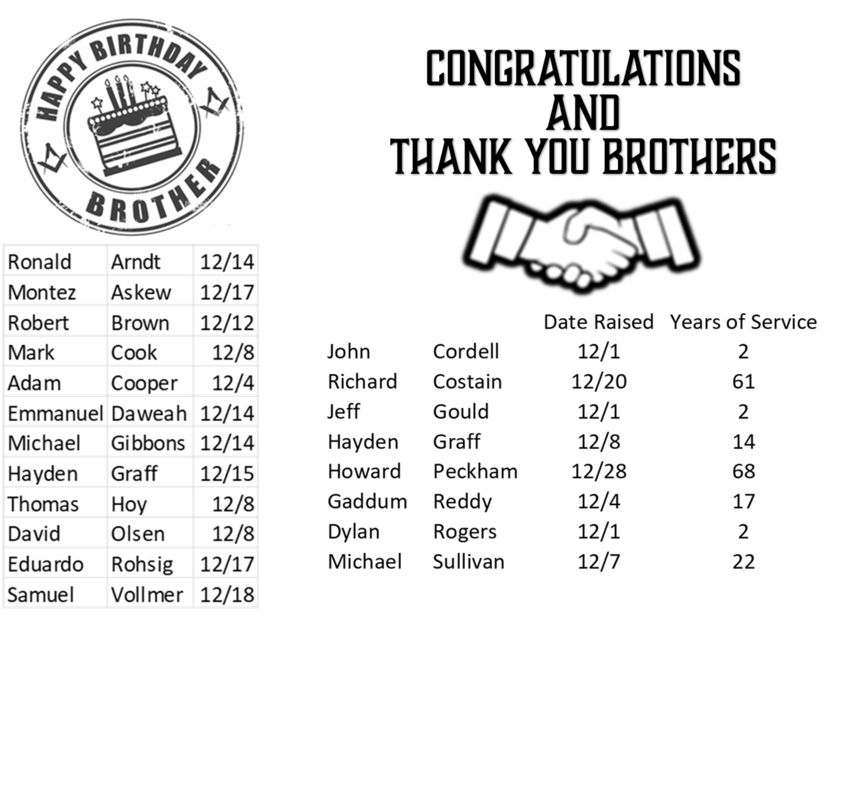 Brothers, Welcome to December! DECEMBER CALENDAR Click on the date to take you to the event on Grand View for details December 4, 2025 - Stated Meeting 6:00pm Meal $15 RSVP on Grand View. Option #1 ~ Pay Online, Option #2 ~ Pay At the Door, Option #3 ~ No Meal 7:00pm Stated Experience