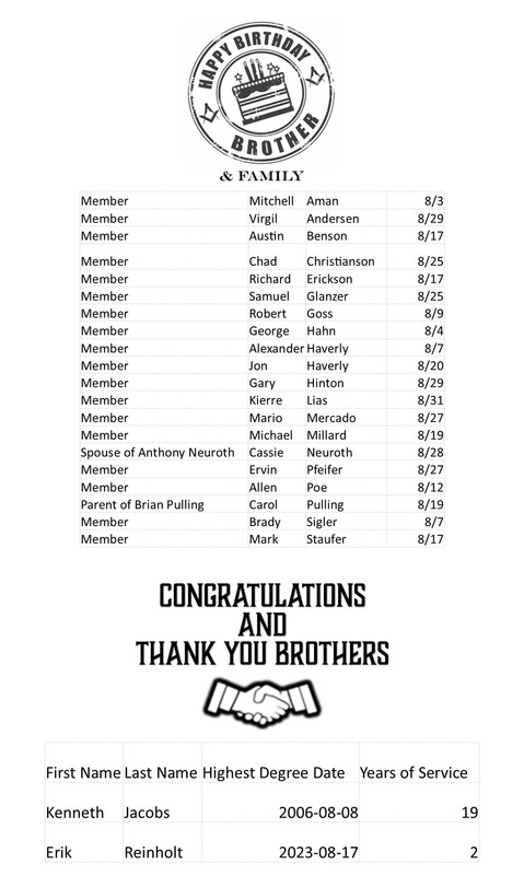 Brothers, Welcome to August! AUGUST CALENDAR Click on the date to take you to the event on Grand View for details August 7, 2025 - Stated Meeting6:00pm Meal. 7:00pm Meeting. Please RSVP for a meal headcount. Only those that RSVP through Grand View will be counted for the amount of meals prepared. To RSVP click on the link above and click 'Register'. Follow directions for three options to pay at the door, pay online, or no meal. The meeting will be opened in EA so that our new Brothers may attend the meeting. This meeting is open to all. We will discuss business related to the entire year to clear the path for many more Lodge Experiences to come! At our August meeting we will hear from our Treasurer on recommendations for the year. We will approve bills related for this Masonic Year. We will cover the calendar for the year, including degree work and events. Plus more exciting Masonic Education and experience! August 2, 2025 - Trinity Lodge's Banquet Project S.O.SThis event is for Trinity Lodge but they could use our help tomorrow. Please click the link for more details and consider helping them out. August 10, 2025 - Minnehaha Lodge Family Day QBBQClick on the event to check out the logo with the chefs!! August 13, 2025 - FC Degree PracticeAugust 21, 2025 - FC Degree