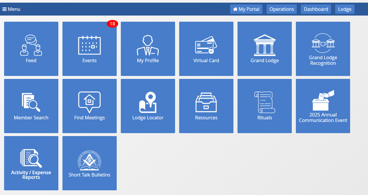 Minutes from our August Meetings: 2025-8-7 Minutes of Stated Meeting.pdf 2025-8-21 Minutes of Special Meeting.pdf Brothers, Are you looking for an easy way to stay connected and find everything about our lodge in one place? If you log into Grand View and go to My Portal you can view the News Feed with all past Newsletters/Bulletins, Resources with all Forms, Calendar of all Events, Search for Members, Update your Profile, and More. You can use this Portal daily if you'd like to stay on top of communication in the feed. A sample of the My Portal dashboard is below (some tiles may differ per user) |
