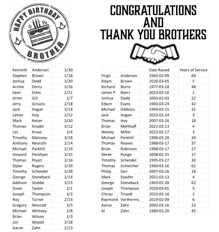 January 15, 2026 ~ EA DegreeTrestle board will be emailed out to Ritual Team. Please fill the sidelines! Trestle board will be emailed out to Ritual Team. Please fill the sidelines! February 28, 2025 ~ MM DegreeTrestle board will be emailed out to Ritual Team. Please fill the sidelines! MINUTES FROM SEPTEMBER: 2025-11-6 Minutes of Stated Meeting.pdf 2025-11-20 Minutes of Stated Meeting.pdf TREASURER'S REPORT: #5 Treasurer's Report November 30, 2025.pdf