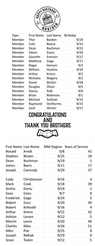 | Brothers, Below are the minutes from our September Experience. 2025-9-4 Minutes of Stated Meeting.pdf Please welcome the new Brothers listed to Minnehaha Lodge No. 5! At this meeting there was a motion made for an amendment to our dues structure. This proposal as it's written is provided below. This proposal will receive action at the October 2, 2025 Stated Communication Proposed change for 10-2-25 action.pdf |