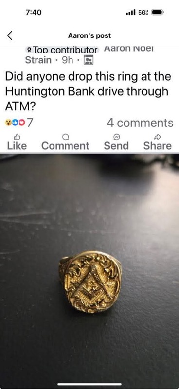 | Brethren, It has been brought to my attention that this Masonic ring was found near the Huntington bank [ the old TCF ] on Friday, if you lost one let me know. Stephen Ingram/Secretary Newport Lodge #118 |