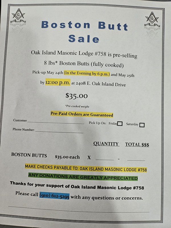 15-20 Boston Butts Left for Saturday. Please get your order in now!!! 2025 Memorial Day Boston Butt Sale (Flier Attached) Pick-Up @ 2408 E. Oak Island Drive May 23rd (12-6 p.m.) Friday May 24th (8-12 a.m.) Saturday $35 each Pre-paid Orders Guaranteed. Make check to: Oak Island Masonic Lodge #758 Send check Brent Wuchae (Secretary) 205 NE 34th Street Oak Island, NC 28465 Boston Butt Sale Flyer 2025 Memorial Day.docx |