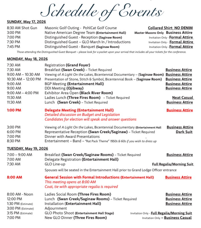 Annual COMMUNICATION MAY 18th - 19th, 2026 Soaring Eagle Casino & Resort • Mt. Pleasant, Michigan It is my honor to invite you to the 200th Annual Communication of the Grand Lodge of Free and Accepted Masons of Michigan, a celebration of 200 years of leadership, service, and dedication by the Michigan Masons. During this landmark session, you will hear a report of the year’s activities and review future programs, initiatives, and budgets for your consideration. Proposed changes to our Blue Book regulations will be presented, and you will elect the Grand Lodge Officers who will help lead us into our third century in 2026–2027. You will also experience the dignity and ceremony that define our fraternity while reconnecting with brothers from all 238 lodges in Michigan and with brethren from other jurisdictions. This is truly a remarkable time to be a Freemason in Michigan, and I look forward to welcoming you to this historic 200th Annual Communication. |