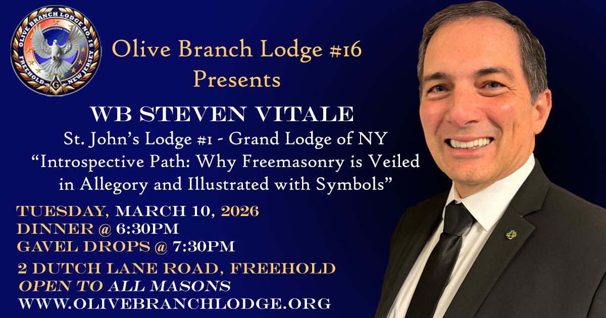 Please join us on Tuesday, February 25th, at our Regular Communication for a presentation by WB Adam Reich on “Masonic Greetings: How Do We Know You?”. This presentation is open to Master Masons only. After the presentation, we will be having the remaining business of the evening. Dinner at 6:30PM; Lodge opens at 7:30PM; Fellowship afterwards. Fraternally, Adam Reich, PM – Secretary (Assistant Secretary to the Grand Master, 2026) (Masonic Secretaries’ & Treasurers’ Association – President) (Masonic Association of Central Jersey – Secretary) 732.305.0380 / secretary@olivebranchlodge.org |