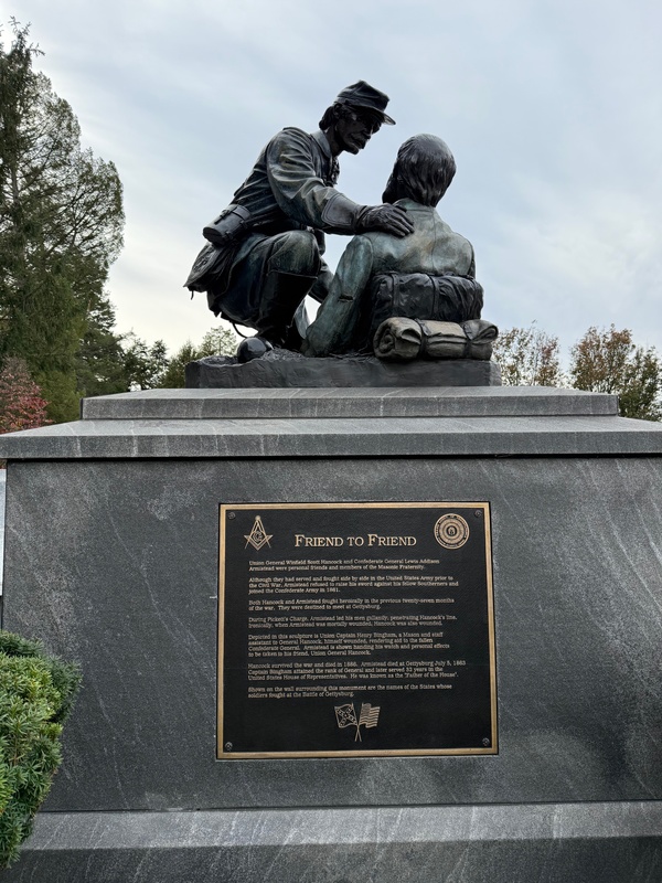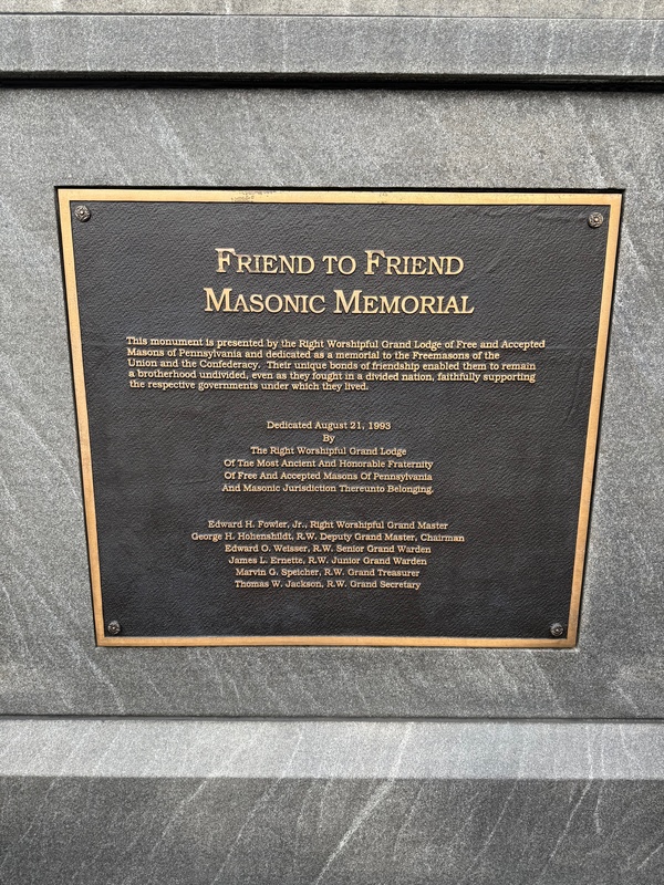 Brethren, I hope this message finds you and your family doing well. This past Thursday, Malin and I travelled down to Gettysburg for an overnight and Friday tour of the Battlefield. I never quite grasped the gravity of what happened July 1,2, and 3, 1863, being there in person and understanding what took place has completely changed that. The enormity of the carnage and how close our country was to being forever changed has left an indelible mark. As we wrapped up the tour our last stop was at the Friend-to-Friend Monument. It is a beautiful, detailed sculpture, if you are ever in Gettysburg, you should put it on your list of things to see. Friday afternoon we headed to Harrisburg for the 66th Eastern Regional Conference of the Red Cross of Constantine. We had a rather large group from CT, and I truly enjoyed their company throughout the weekend. I also briefly visited with Eric Grist from across the border in Rhode Island. It was nice to be able to catch up with him and his endeavors. Also occurring on Saturday, WB Evan travelled to Meridian Lodge for the secretary’s seminar and Bros Craig and Micah ventured up to Boston for a Scottish Rite meeting. This coming Thursday we will gather as usual for a little fellowship and perhaps a cigar, please stop by and visit, you’ll be glad you did. May the God of Peace delight to dwell with and bless you. WM Rob Stated communications and upcoming events for 2025 November – Sunday 11/30 @ 1100 Audit and Rehearsal for Annual December - Saturday 12/6 - @ 1000, Annual Meeting |