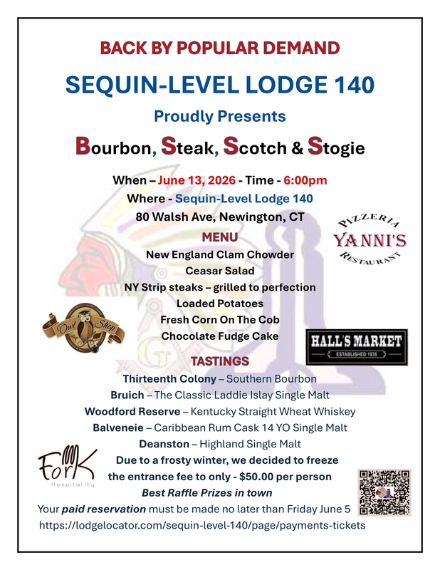 Sequin-Level 140 is not levied the $65 per capita charge by Grand Lodge for our Affiliate Members nor our "50 year Membership Award" Brothers. Masons who are primary members with another Connecticut lodge are "Affiliate Members" at Sequin-Level 140 and are obligated to pay $135 as their $65 per capita to Grand Lodge is paid by their primary lodge only. We do encourage our 50 Year Brothers to consider donating this portion ($135) here to help Lodge operations. Or consider donating any other amount you can below.