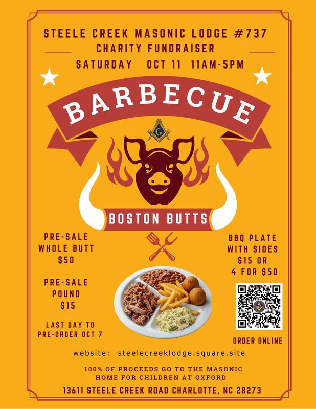 Brethren, We are having our BBQ Fundraiser on October 11. We will need a lot of help. So please sign up by contacting David Whalen at 980-389-3971 or drakester300@gmail.com with the day(s) and time(s) you would like to volunteer. October 9 - Thursday, prep at 6PM October 10 - 5am cooking October 11 - BBQ serving: 11am - 2PM, 2PM - 4PM and cleanup. Thank you, David Whalen |
