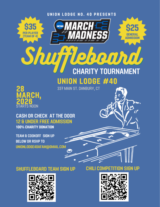 Also, we are pleased to announce that we will be once again hosting our March Madness charity shuffleboard tournament and chili cookoff on Saturday April 2 at noon. Please keep an eye out in the next issue of CT Freemasons or contact WB Chris Gould at CTGolden1@aol.com for more information.