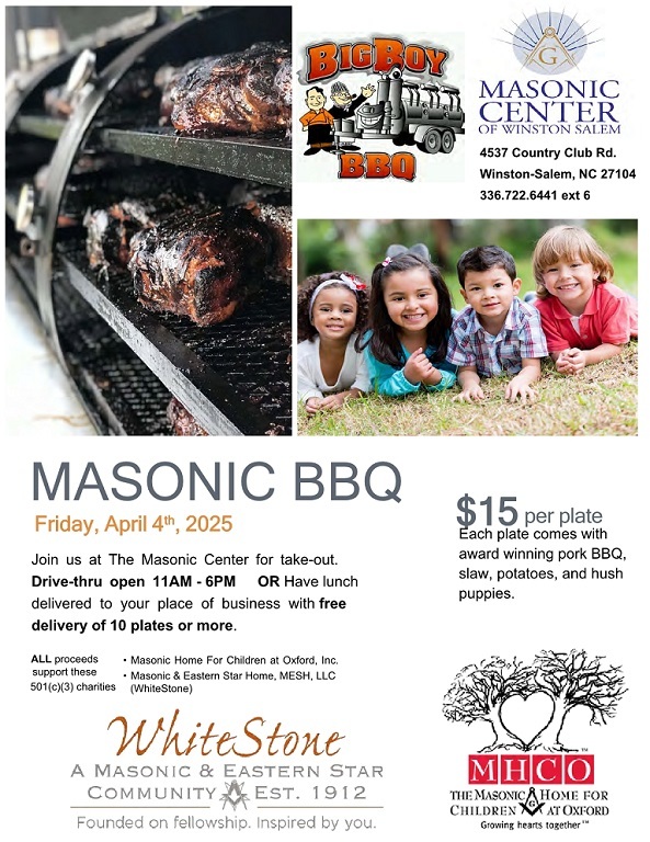Hello Brothers of West Bend #434, It is once again time for the Masonic Center's Spring Masonic BBQ. This takes place this Friday, April 4, from 11:00 a.m. until 6:00 p.m. or until they run out. Delivery is available for lunch for orders of 10 plates or more. Otherwise, drive through only. Cost is $15 per plate and $15.00 per pound. Menu is the same: smoked pork, BBQ potatoes, BBQ slaw, and freshly cooked hushpuppies. The Brothers at the Masonic Center are looking for volunteers! Drivers are needed on Friday for deliveries from 11:00 AM until 1:30 PM. On Friday, they will start chopping the BBQ at 6:30 AM. They'll need people to chop and again at 10:15 when they start making up plates. Volunteers are also needed Thursday at your convenience; they will cup containers of slaw and containers of BBQ sauce. They will smoke the pork on Thursday most of the day. Come on by if it is within your cabletow and help out. It's a good time and good fellowship for a worthy cause! All proceeds support the Masonic Home for Children at Oxford and the Fraternal Friendship Program (MESH, LLC) at WhiteStone. Please see the attached flyer! Sincerely & Fraternally, Bob Blair, Secretary, West Bend #434 Masonic BBQ Apr2025_sm.jpg |