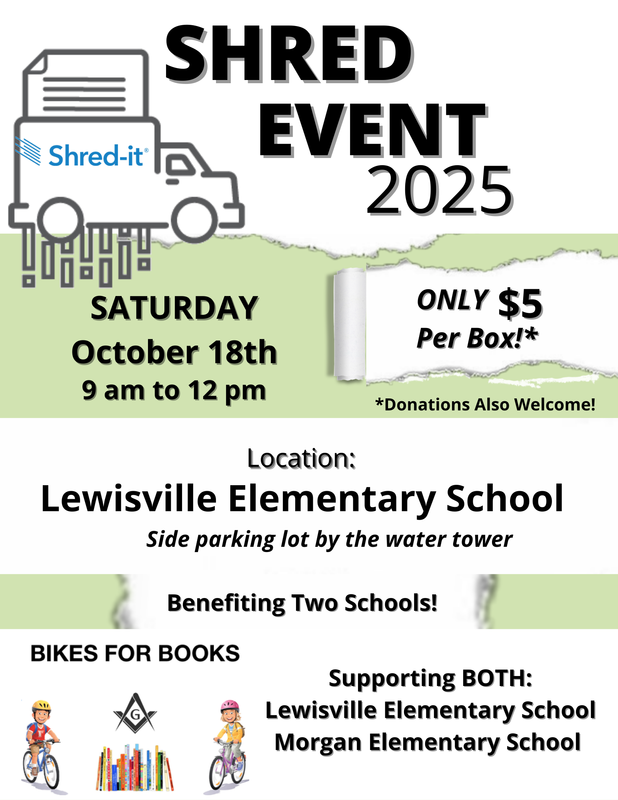 Saturday April 20th Shred Event at Lewisville Elementary School. 9 AM-12 PM. Need helpers and spread the word around that we need paper to shred. This benefits the Bikes for Books program at Lewisville Elementary School and Morgan Elementary School.