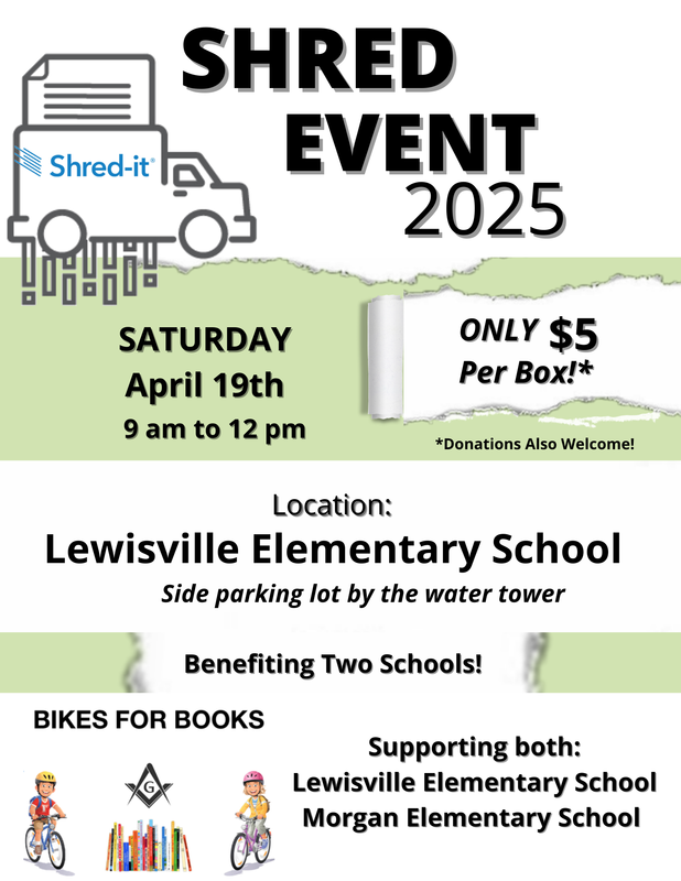 Good Afternoon West Bend Brothers, I just wanted to take a quick moment to remind you that our Fall shredding event in support of our Bikes for Books program takes place this Saturday morning October 18th at 9:00 a.m. in the Lewisville Elementary parking lot. If you have anything you need shredded, please come on out and support this event. Also, please share the attached flyer on your social media pages. It's a great way to support our Lewisville community! Sincerely & Fraternally, Bob Secretary, West Bend #434 Shred Flyer 2025 - New.png |