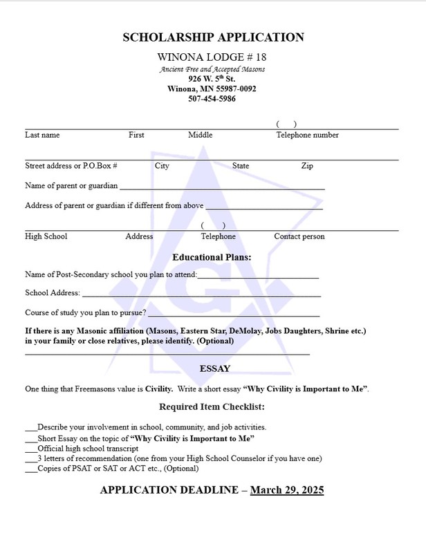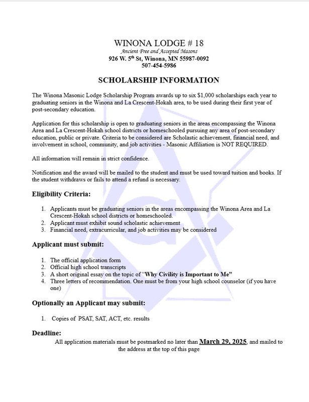 Don’t miss this chance to take the next step toward your future with the support of Winona Lodge #18. Apply today!