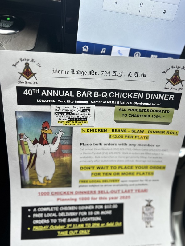 Berne Lodge #724 is having a BAR B-Q Chicken Dinner Fundraiser on Friday, October 3rd from 11 am - 2pm or until sold out. TAKE OUT ONLY! plates only $12 Dollars. Please reach out to Richard L Smith Sr. for more information Fraternally Yours, Richard L Smith Sr Secretary Berne Lodge |