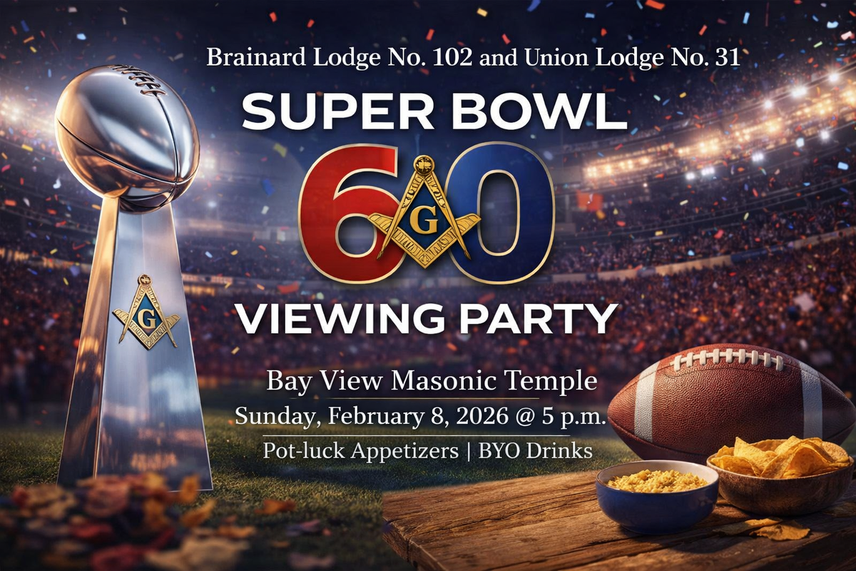 Join us next Sunday for a fun evening of football, food, and great company as the New England Patriots face off against the Seattle Seahawks in Super Bowl 60, live from Levi's Stadium in Santa Clara, CA. Brainard Lodge No. 102 is proud to partner with Union Lodge No. 31 to host a Super Bowl 60 Viewing Party at the Bay View Masonic Temple on Sunday, February 8, 2026, beginning at 5:00 p.m. with game kick-off at 6:30 p.m. This will be a relaxed, family-friendly evening, and Brothers, families, friends, and prospects are all welcome to join us. Come enjoy spirited conversation, pot-luck appetizers, and the excitement of the biggest game of the year, all while spending time with Brothers from both Lodges in a warm and welcoming setting. Whether you stay for kickoff or the whole game, we hope you will come out and share an evening of fellowship, laughter, and Brotherhood! |