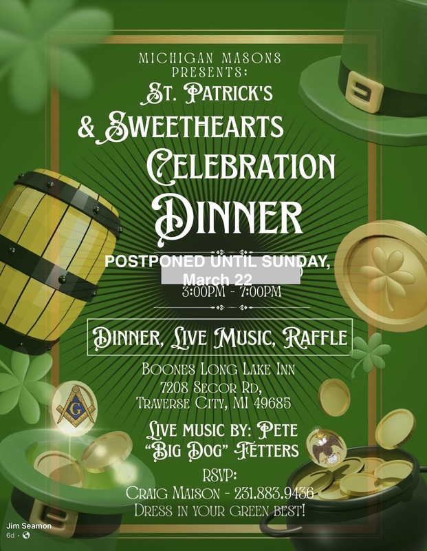 | URGENT NOTICE! Due to the impending storm with travel precautions posted, the Sweetheart's Dinner scheduled for Sunday, March 15 has been postponed until the following Sunday, March 22. It will still begin at 3:00, still at Boone’s Long Lake Inn, and will still be a wonderful event. Please contact Brethren you know plan to attend and let them know! And, of course, be safe out there! Fraternally, Hawk Hawkins, Secretary |