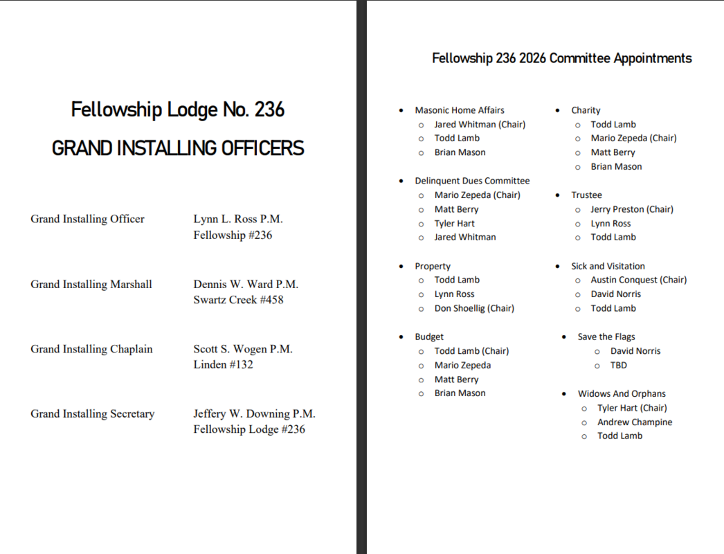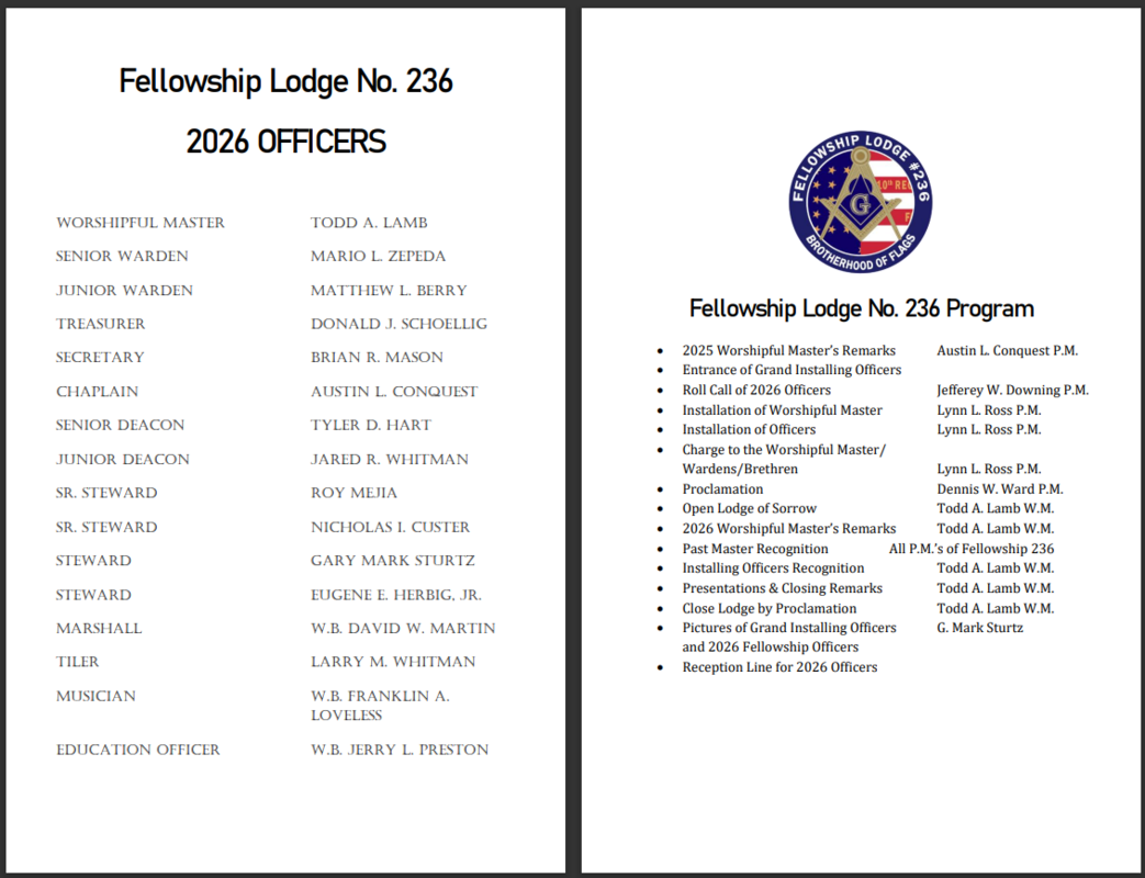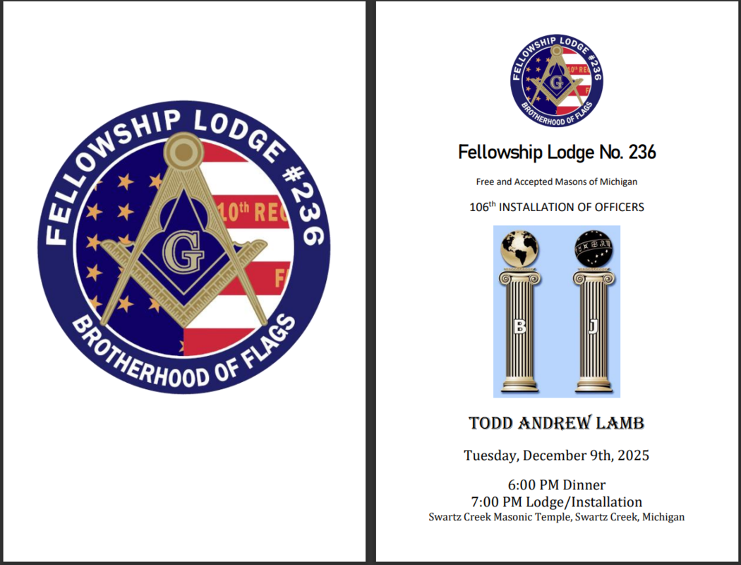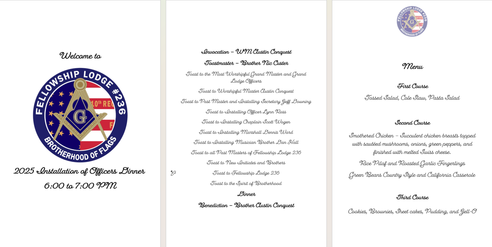 This is just a reminder of our meeting tomorrow night, Tuesday, December 9th. We will have another awesome meal starting at 6pm (See dinner program below for details). We will then make our way to the lodge room for a 7pm Special Communication where Worshipful Master Austin Conquest will open the lodge on the Master Mason Degree to install our slate of officers for 2026 (See Installation program below for details). Please come out and support these new officers with your presence as they begin their work to revitalize the lodge!