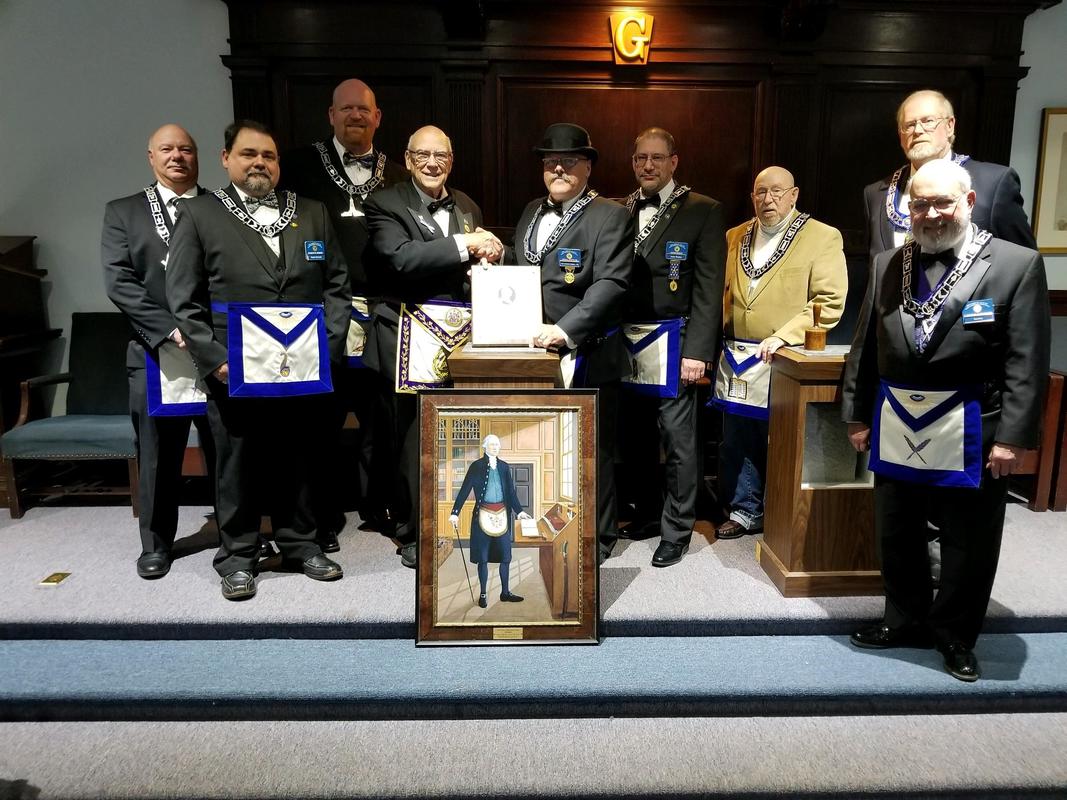 The Master, Wardens, and brothers were presented with the portrait of George Washington and plaque commemorating their induction into the Society of Washington Lodges. This is a society that pledges to help the George Washington Memorial in Washington DC.