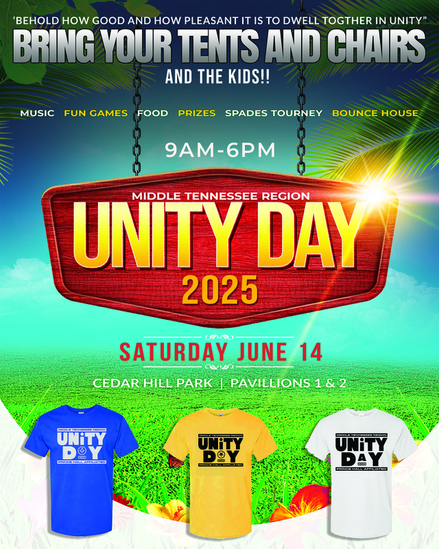 | Greetings Brothers, Unity day is about 6 weeks away and we are in the final planning stages. JW Ware will have more information regarding signing up for activities and items needed for the day. As usual we will have our district T shirts for the day. Please go to the following link to submit your order for your T shirt https://www.cognitoforms.com/NashvilleMasonicDistrict/LodgeUnityDayTshirtOrderForm. Please submit your shirt order and payment no later than 12:00 PM on May 23. If you have questions regarding ordering please let me know. Looking forward to another successful Unity Day. Fraternally, WM Agee Unity Day 2025 flyer.jpg |