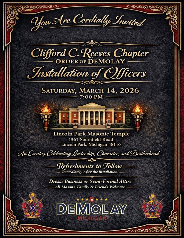 | Brothers, Family, and Friends, You are invited to the Installation of Clifford C. Reeves Chapter, Order of DeMolay happening this Saturday, March 14th, at the Lincoln Park Masonic Temple! The event begins at 7PM and will have refreshments to follow. Please come out and support these young men as they assume duties of responsibility in their Chapter! |