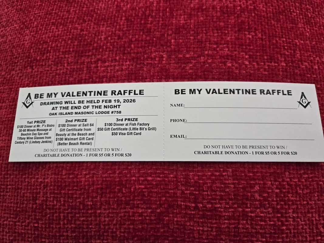 | 2025 Valentine's Day Raffle $5 per Ticket or Five Tickets for $20 Contact a Lodge Member or Secretary (Brent) @ 910-612-5295 Drawing will be held on February 20, 2025 @ Stated Communication Three Winners will be drawn for the following prizes First Prize: $100 Dinner @ Mr. P's Bistro & 30-60 Minutes Massage @ Beachin Day Spa. Second Prize: $100 Dinner @ Salt 64, $125 Gift Certificates @ Beauty @ the Beach & a Skylight Picture Frame. Third Prize: Tiffany Wine Glasses, $50 Gift Cards from Lil Bit's Grill & Oak Island BBQ House. Please help support this important fund raiser. |