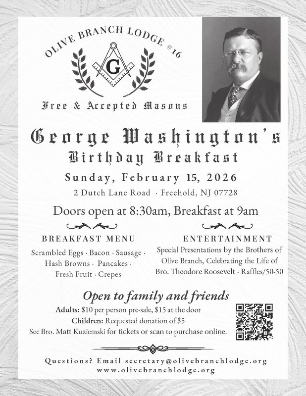 Join us on Sunday, February 15th as we host our annual George Washington Birthday Breakfast! This year, the Brothers will be presenting on Brother President Theodore Roosevelt! Doors open at 8:30AM with breakfast in the Fellowship Hall. The Presentation will be upstairs in the Lodge Room about 9:30AM.Open to Masons, Friends, and Family Adults $10 in advance, $15 at the door. Children: requested donation of $5 |