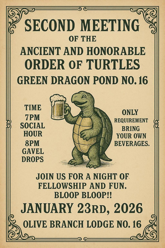 Be it known to all good fellows, friends, and kin: The Second Meeting of the Ancient and Honorable Order of Turtles shall be convened this Friday eve.