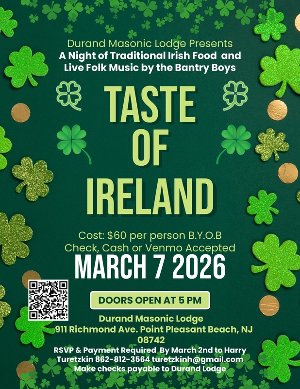 ☘️ Music, food, and Irish Spirit! ☘️ Join Durand Lodge #179 for an unforgettable evening at their Taste of Ireland Fundraiser on March 7, 2026 at 5:00 PM. Enjoy traditional Irish fare, live music by the Bantry Boys, and great fellowship as we celebrate Irish heritage together. Tickets are $60 per person, BYOB, and proceeds support their Lodge and community initiatives. Seats are limited, so reserve yours today and don’t miss this fantastic night! Please use the QR code or the button below to register. |