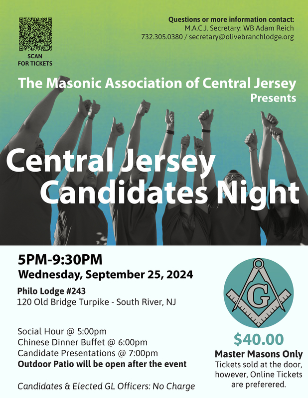 4:00 PM SOCIAL | 5:00 PM DINNER | RECEPTION TO FOLLOW Choice of Filet Mignon, Chicken Française, Atlantic Salmon Attire: Black Tie Optional RSVP by September 24TH Payable to: Fidelity Lodge No. 113 Mail to: BUTCH ELLIOTT 38 MAIN STREET FLANDERS, NJ 07836-9112 Tables of 10 may be reserved by providing a list of all guests attending, Meal Selection, and payment in full by September 24th. 201.390.3415 | butch0012@gmail.com 2025 GMar-SGM Reception 251004.pdf Fraternally, Adam Reich, PM – Secretary (Masonic Secretaries’ & Treasurers’ Association – President) (Masonic Association of Central Jersey – Secretary) 732.305.0380 / secretary@olivebranchlodge.org |