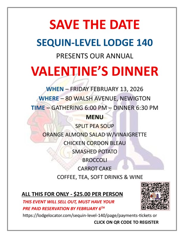 The Sequin-Level Lodge #140 Craftsman's Club is pleased to invite you and your spouse/significant other to our Annual Valentine's Dinner at the Lodge on Friday, February 13th, 2026. Please see the flyer below for details. Cost is $25.00 per person. Please Add to Cart a separate reservation for EACH person that will be attending the Dinner.