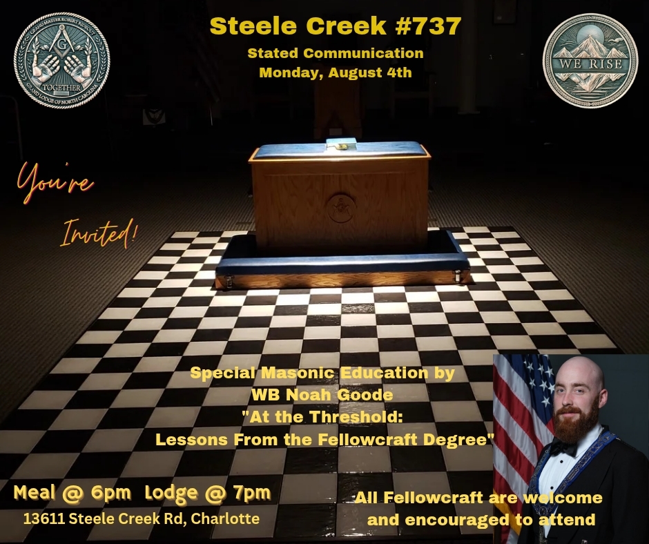 I hope this letter finds you all healthy and eager to continue our journey of friendship, morality, and brotherly love. My year as Master of Steele Creek Lodge is flying by. It seems like just yesterday I was opening the lodge for our first Stated Communication of the year. I am happy to say that in my opinion we have already accomplished a lot this year, but we are not done. We have not been blessed with a lot of new candidates this year, but we have still managed to stay busy practicing the ritual and having some excellent Masonic educations. With the help of some eager Brothers, and some very knowledgeable past Masters, we have started an OSW/ Master Masons Catechism class. This class has already been a success and I hope it continues to grow. We did receive notification, via Facebook, that we will be awarded the Platinum level certificate for all our hard work on Lion and Pillar this year. Again, thank you for all your hard work to accomplish this. At the time of the report being published, we were the only Lodge in the 32nd district to receive such level. On July 22nd Steele Creek Lodge had an Entered Apprentice degree, with Br Bryan Burroughs in the East. Br David C Elderbroom was initiated and has already begun his journey to becoming a Master Mason. I was on vacation and unable to attend this degree, but from what I was told it was a great degree. Br Elderbroom and his wife have already expressed an interest in helping out with our upcoming breakfast fundraiser, so I have no doubt that he will be a hard worker, and an asset to our Lodge. Speaking of breakfast; our Lodge will be having a breakfast fundraiser on August the 24th. The proceeds will be going to the Masonic home for Children in Oxford. I don’t have to tell you how many Brothers it takes to put on such a fundraising event, so please come out and give a lending hand for a few hours on that Saturday morning. This is a great opportunity to fellowship with your Brothers and offer up a nice breakfast to the residents of Steele Creek and the surrounding area. Your Junior Warden, Br. Bryan Burroughs, is in charge of this fundraiser, so please reach out to him if you have any questions or would like to come out and help. If you don’t have a couple of hours to give, then please try to come by and support the fundraiser. Enclosed with this letter you will find a flyer with a QR code at the bottom. Please share this flyer with your friends, family, coworkers, or share it on FB. You can scan that code and prepay for your meals to help us plan accordingly, or to make a donation to help support the fundraiser if you can’t make it. Remember it takes all of us to make a fundraiser successful. Below you will find the Trestle Board for the month of August. Please take note that our Stated for September will be on Tuesday the 3rd instead of Monday, to give our Brothers time to spend with their families on Labor Day. I look forward to seeing everyone there. Mark Ledford Worshipful Master Steele Creek Lodge #737 The July Trestle Board is as follows: Aug 5th Stated Communication Aug 12th 6:30pm. OSW, Ritual, and Master Masons Catechism practice Aug 18th 6:30pm. Practice for a FC Degree Aug 24th Breakfast Fundraiser 8am until 11am Aug 26th 6:30pm. Officers meeting September 3rd Stated Communication. Meal at 6pm meeting at 7pm |