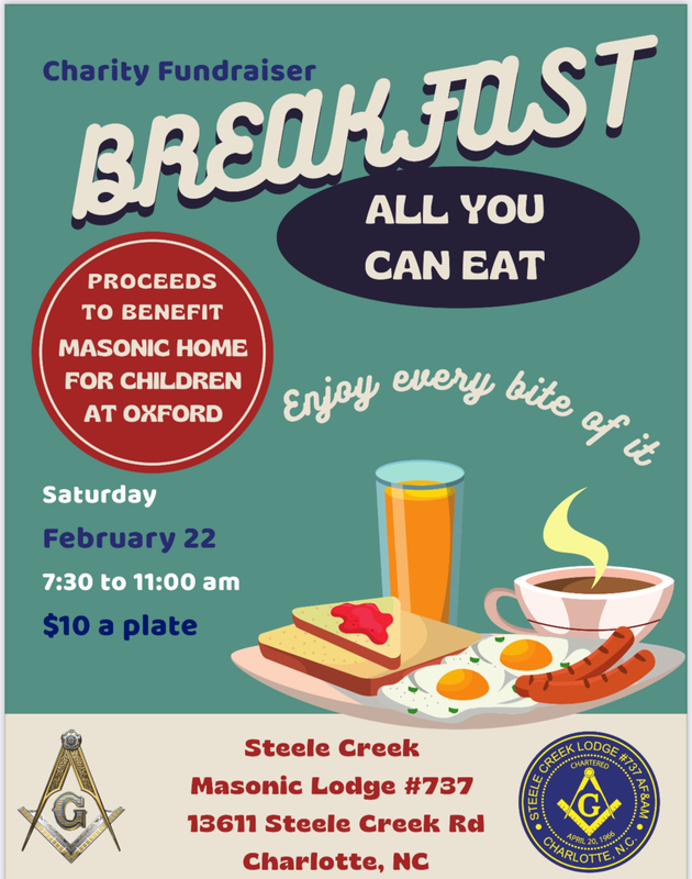 | Brethren: We’d like to invite you and your family and friends to come out and support YOUR Lodge as we enjoy our always excellent breakfast and fellowship as we raise money for our Masonic Home for Children at Oxford on Saturday the 22nd of February. (See attached). Please spread the word (locally and on social media) so we can make this breakfast “one to remember”! We need volunteers as well (contact me at (704) 737-5800). Can we count on seeing you there? If you cannot attend, can we count on your financial support by donating to the cause? Fraternally, John Adams Senior Warden |