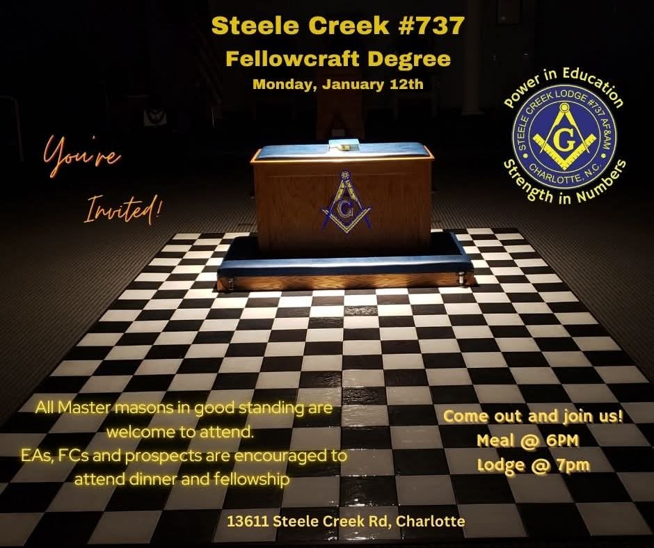 Dear Brethren, You are warmly invited to our annual Lecture Service, a cornerstone event where we come together to hone our ritual work and uphold the excellence of our craft. Help us maintain the reputation that Steele Creek is known for in doing outstanding Degree Work . This mandatory five-hour session is a chance to strengthen our fraternal bonds and ensure our lodge remains proficient in our ritual work, which is our duty to uphold. We especially call upon our esteemed Past Masters to join us, bringing their invaluable wisdom and experience to enrich our study and inspire our newest members. WB Richard Gelsomino will be conducting the session. Event Details: