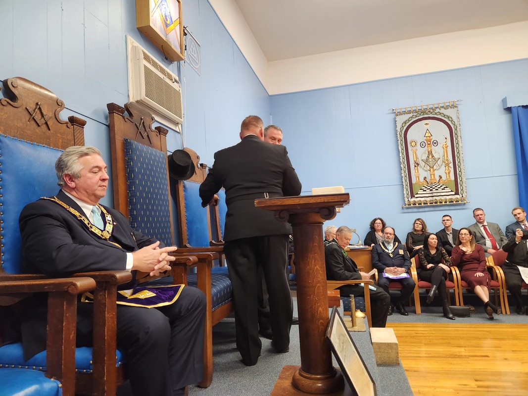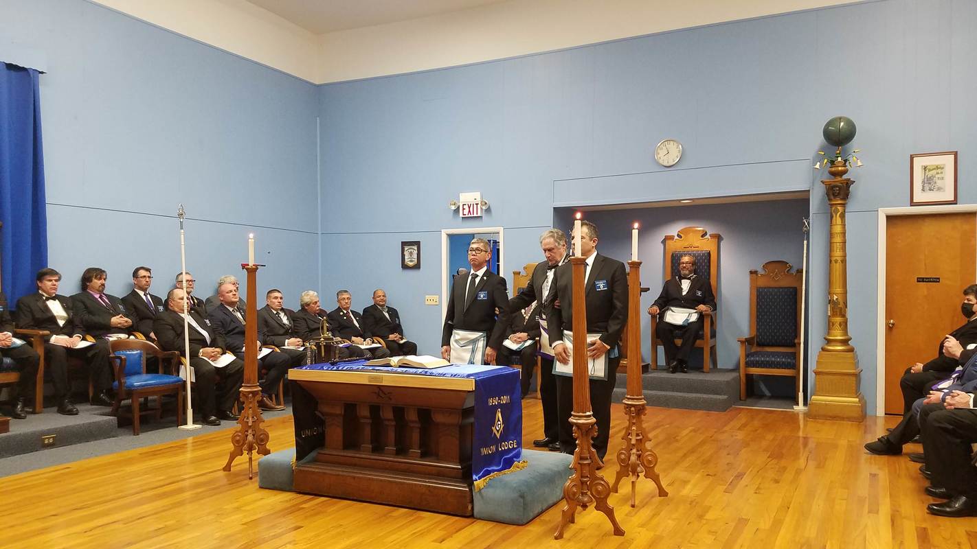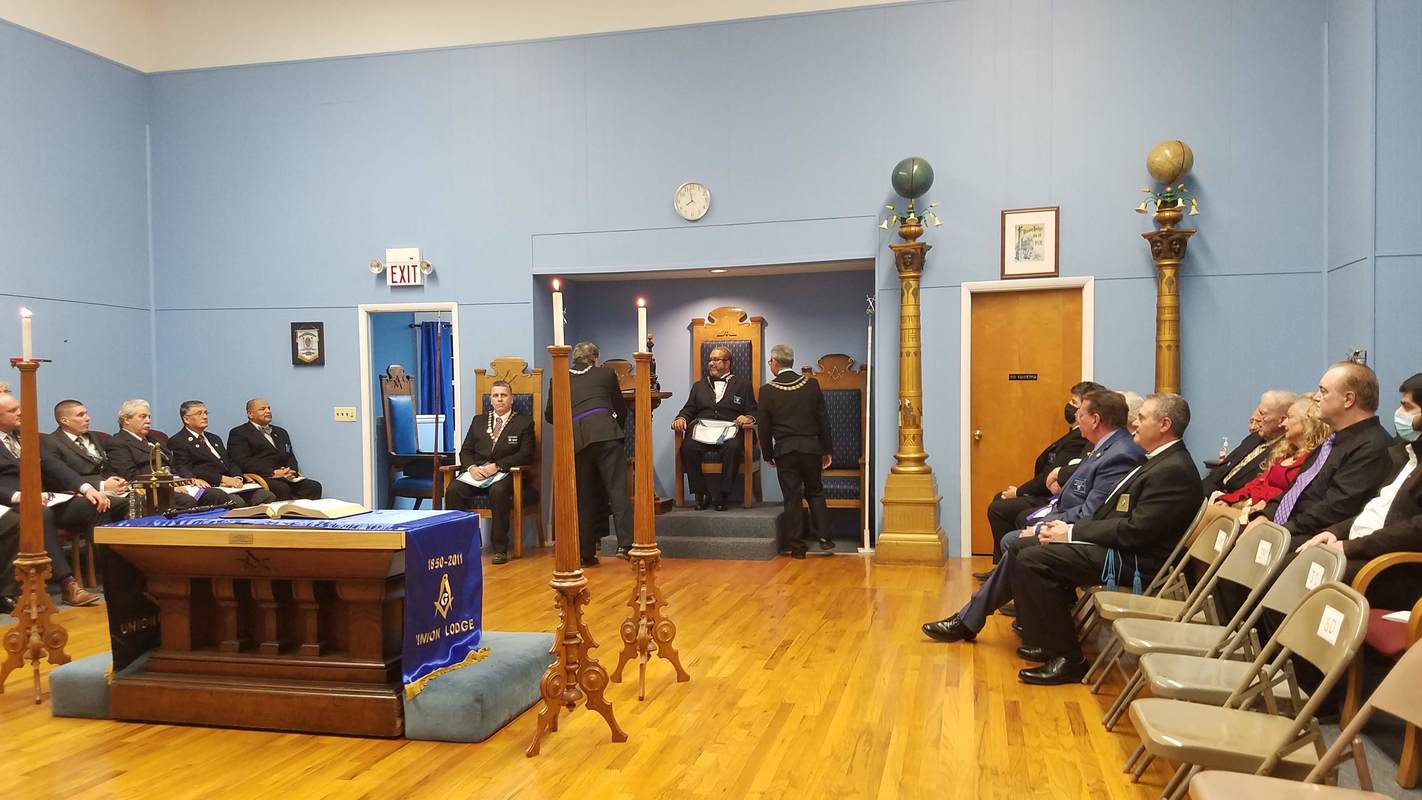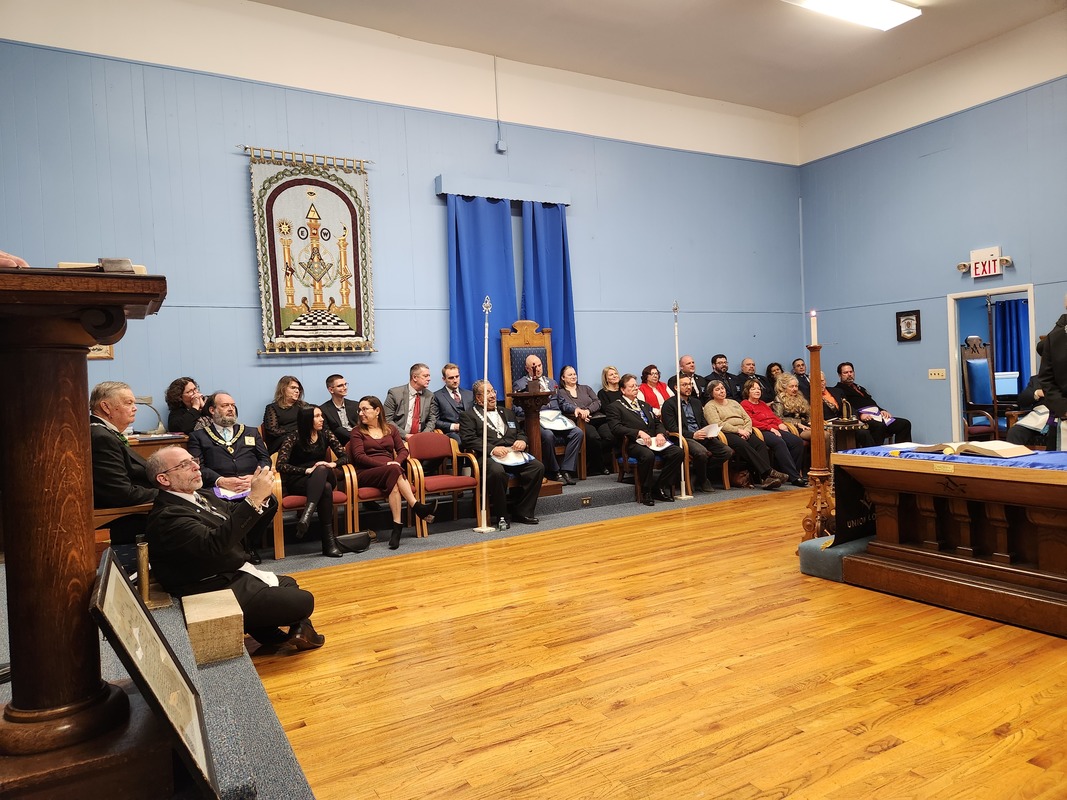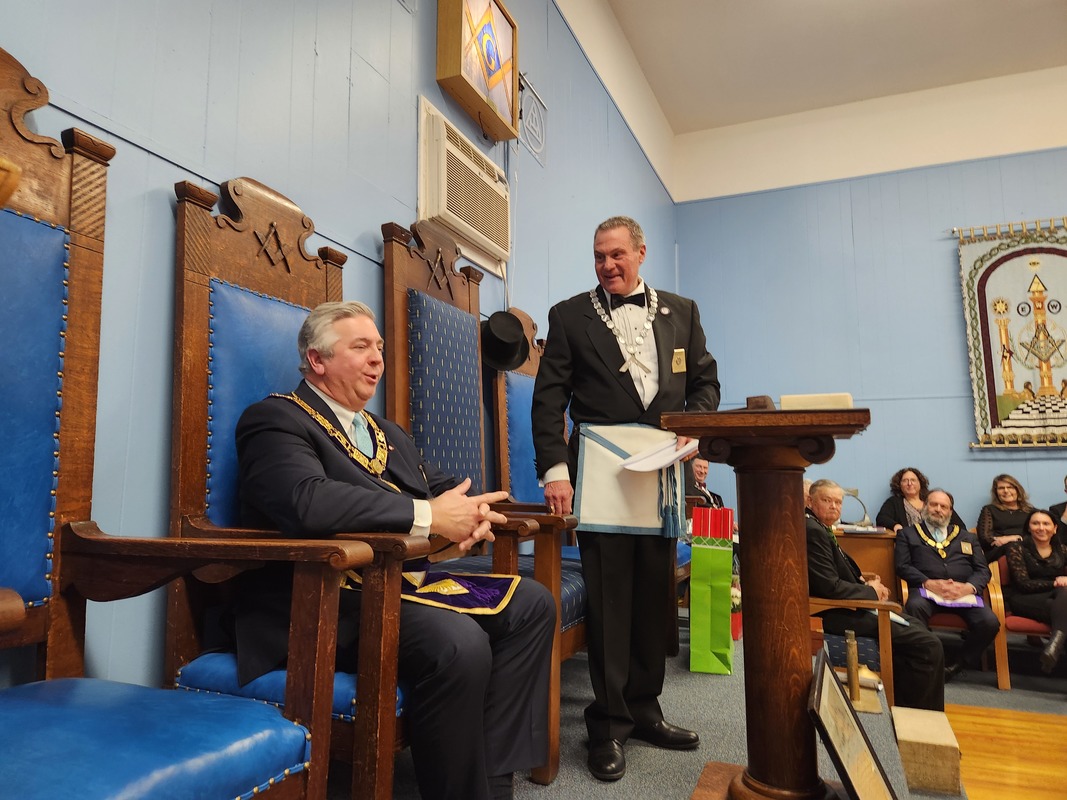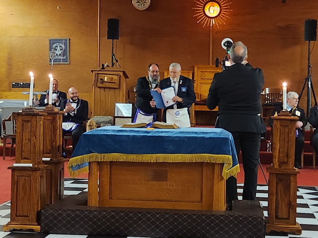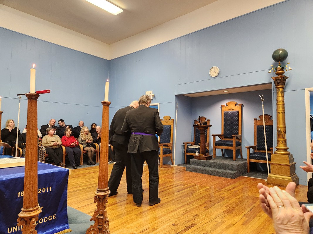 Benjamin Franklin speaking about his history as a Mason at a Union Table Lodge