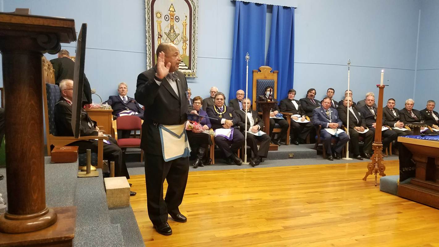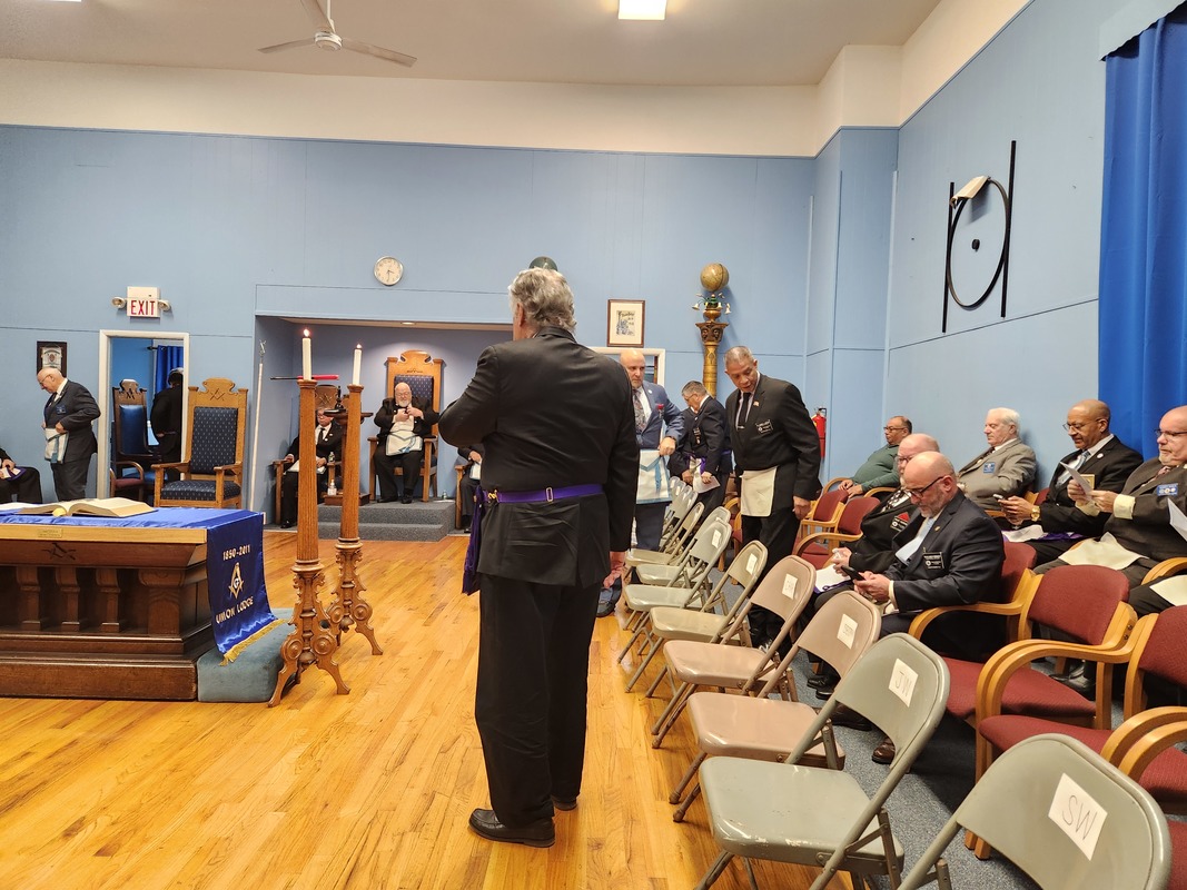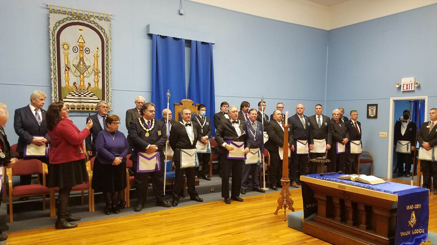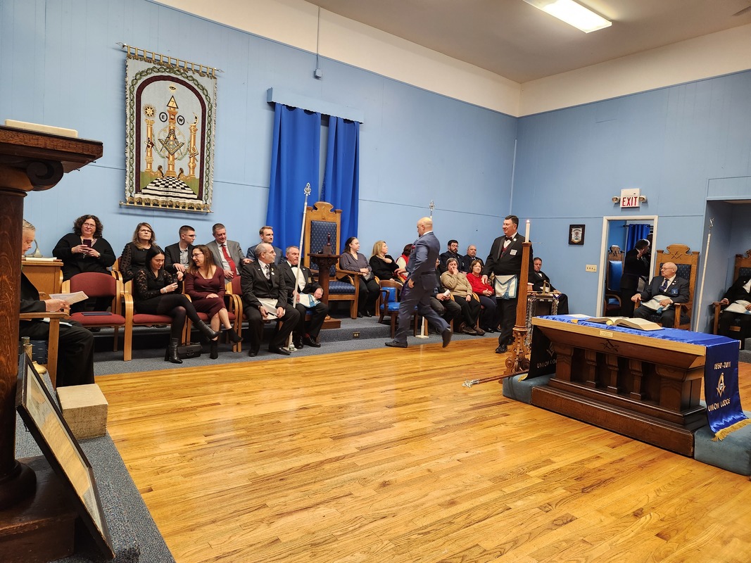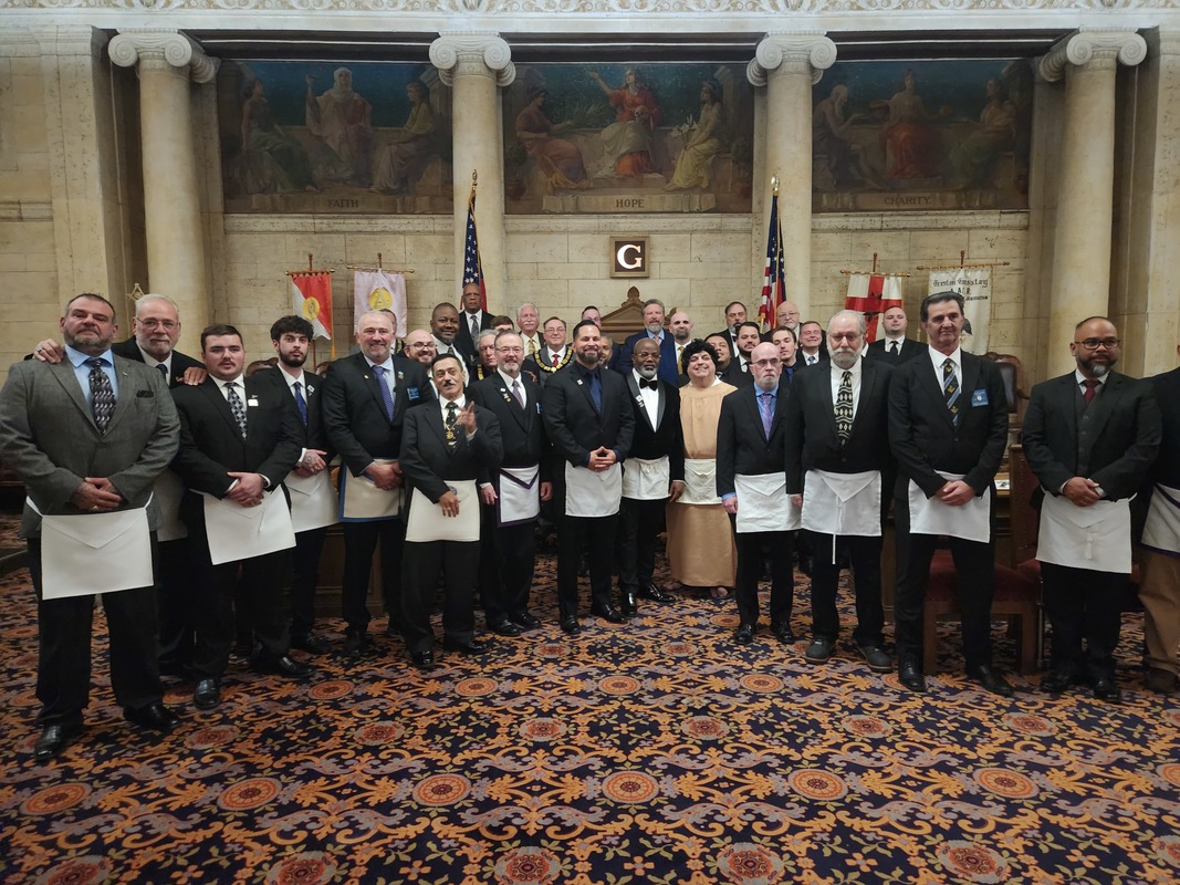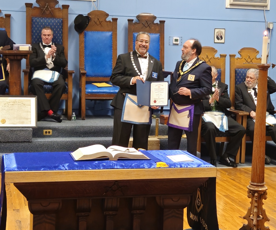 Benjamin Franklin speaking about his history as a Mason at a Union Table Lodge