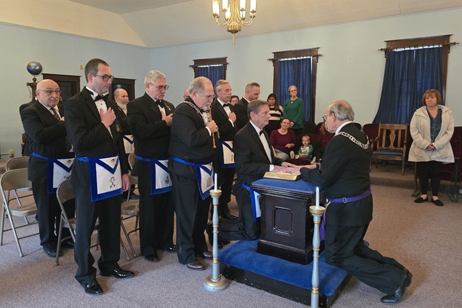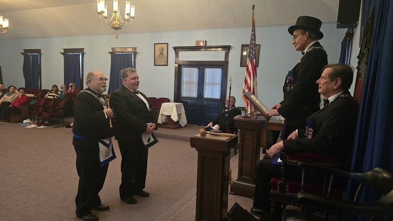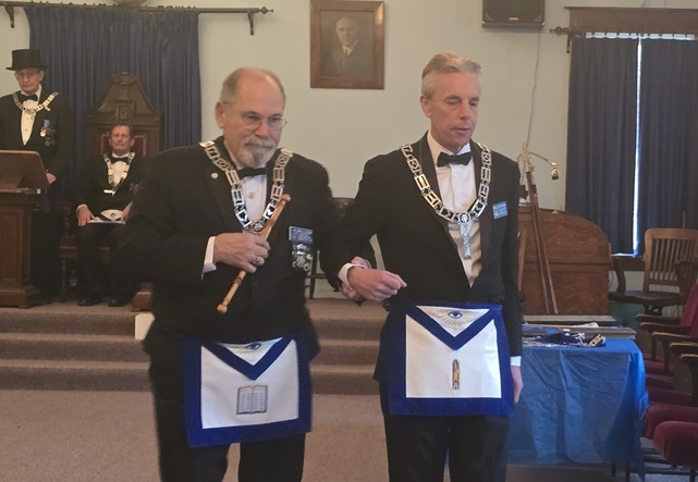 WB Peter Van Doren Junior Warden for 2026 escorted by WB James A. Locicero